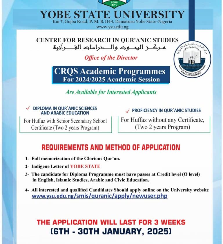 Uncategorized Center for Research and Qur’anic Studies (CRQS) To Commence 2024/2025 Application into Diploma Programs and Arabic Education Mohammed Alh. GanaJanuary 11, 2025January 11, 2025 Read More